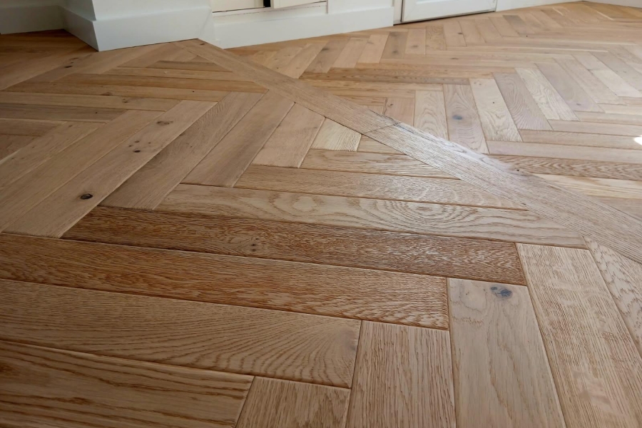 🎉 Pour bien commencer l'année, retour sur ce superbe projet : un magnifique parquet massif Arbony, Panneau de Versailles avec navette Manoir Chêne N°1, installé avec soin à Dinard.