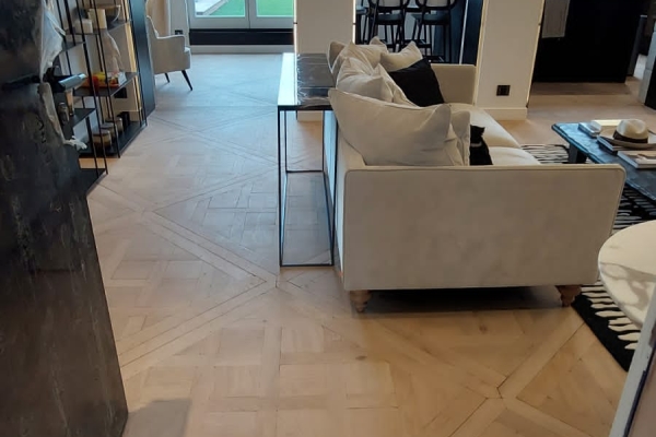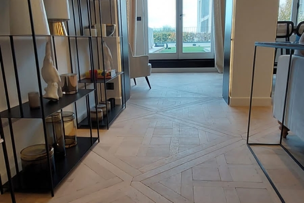 🎉 Pour bien commencer l'année, retour sur ce superbe projet : un magnifique parquet massif Arbony, Panneau de Versailles avec navette Manoir Chêne N°1, installé avec soin à Dinard.